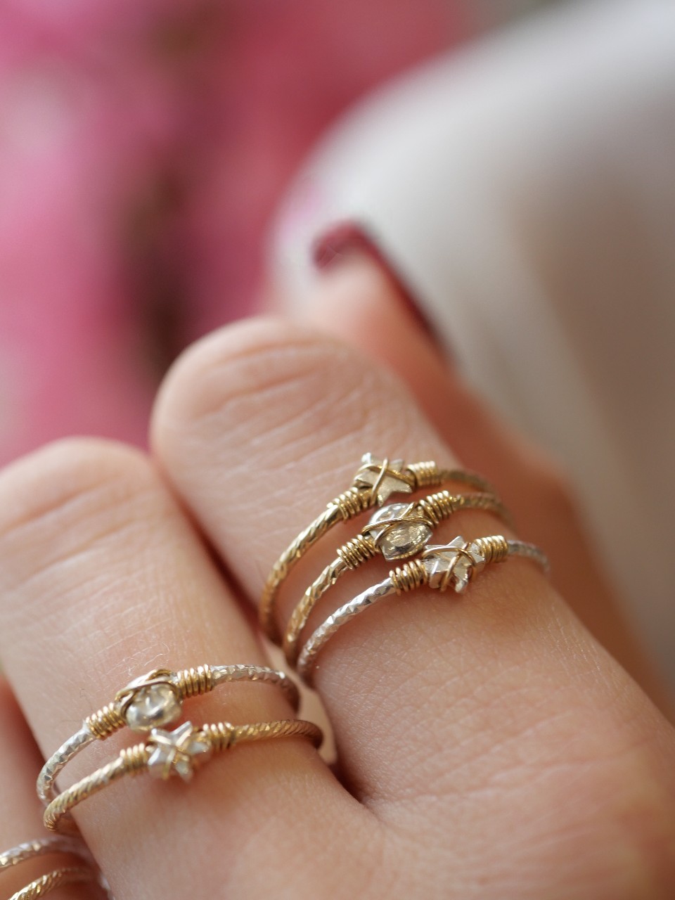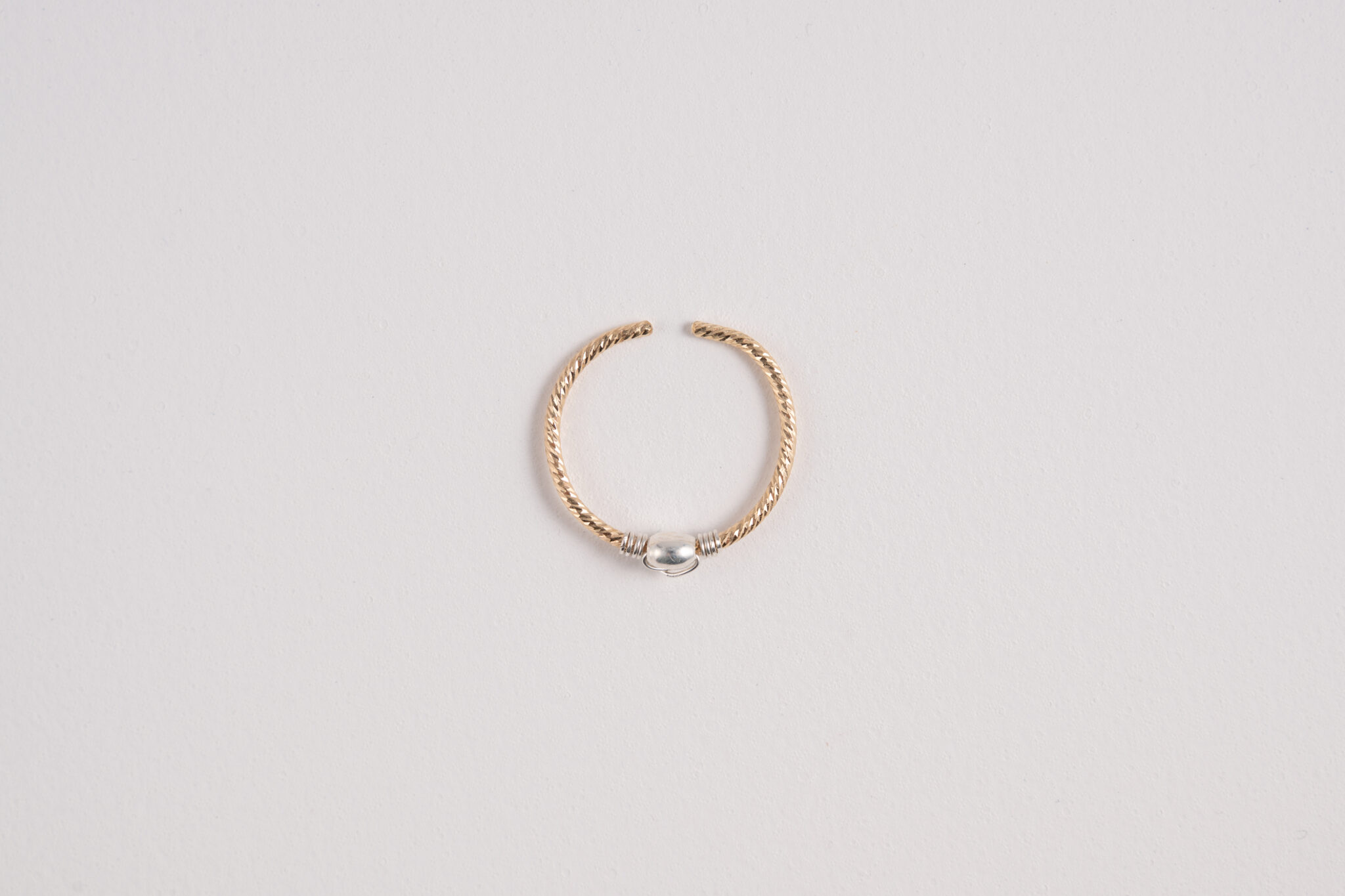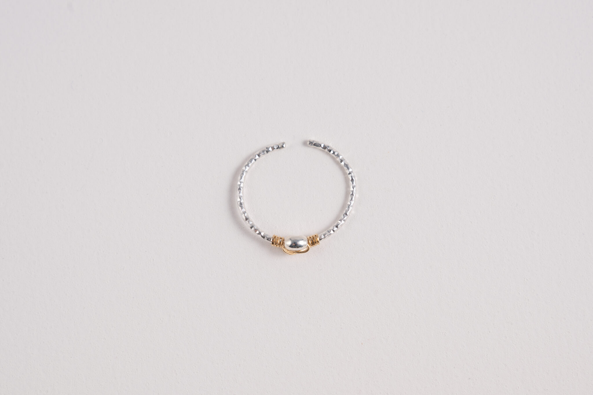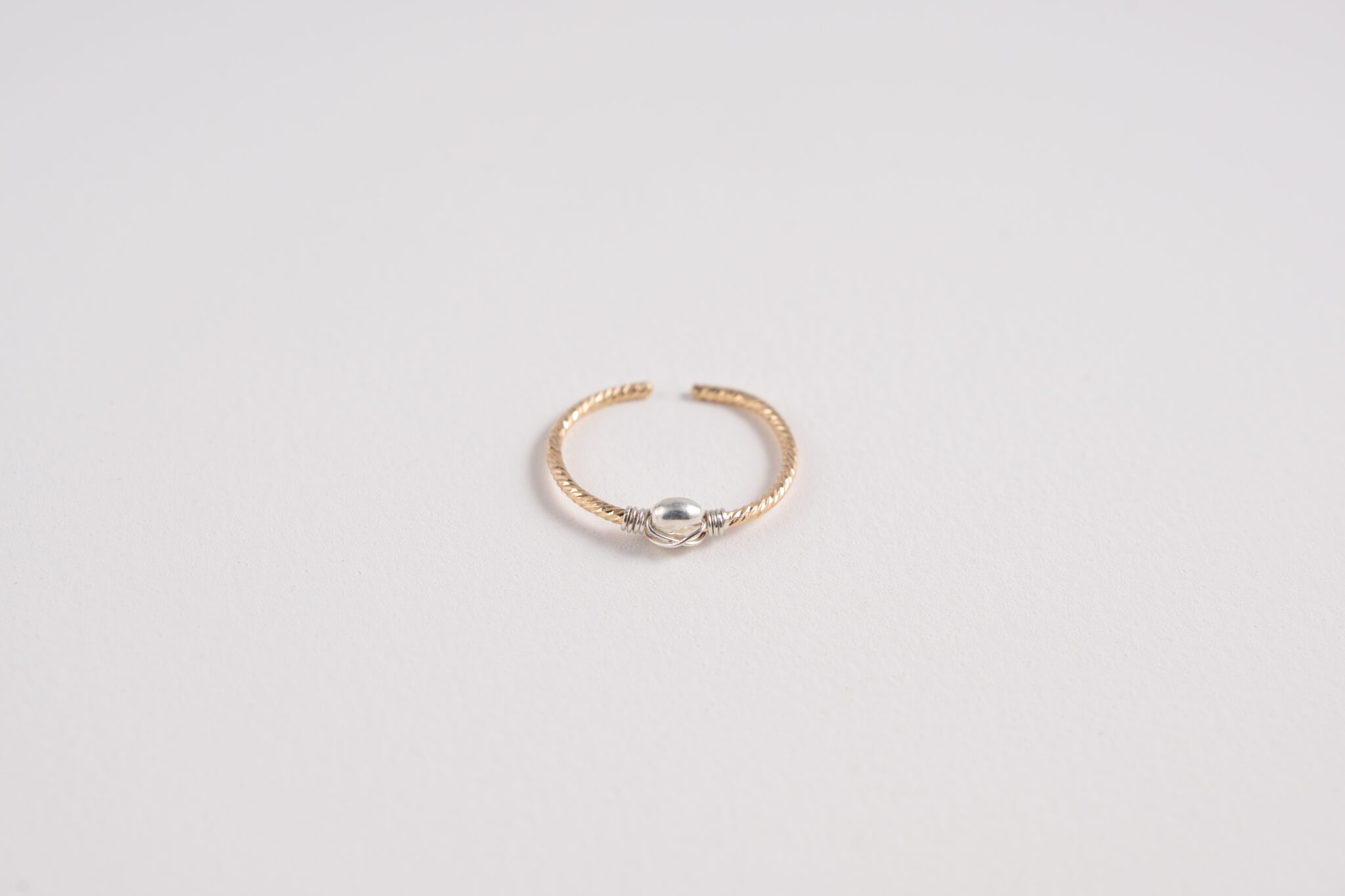 La bague Pearl, ajustable, faite main met en valeur une perle centrale martelée, délicatement entourée d’un fil croisé qui souligne sa forme avec subtilité.