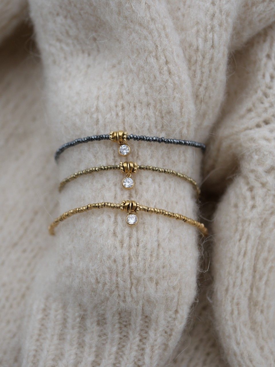 Le bracelet Alba se décline en plusieurs variations, toutes composées de perles fines d’hématite aux reflets subtils et à l’esprit rock chic. Au centre, une pampille en gold filled ornée d’un cristal lumineux apporte une touche de raffinement intemporel. Un bijou élégant, facile à porter au quotidien comme pour les grandes occasions.