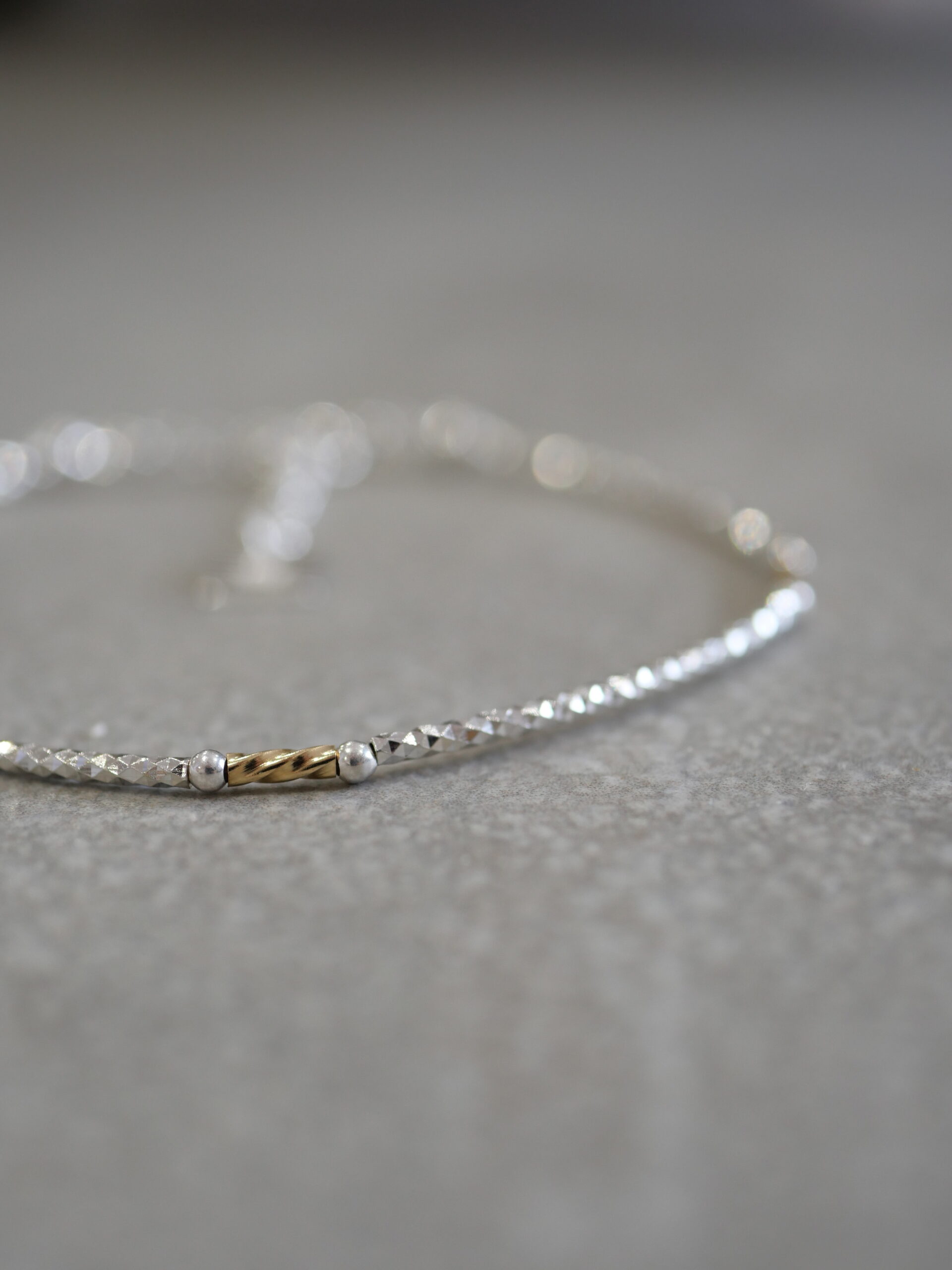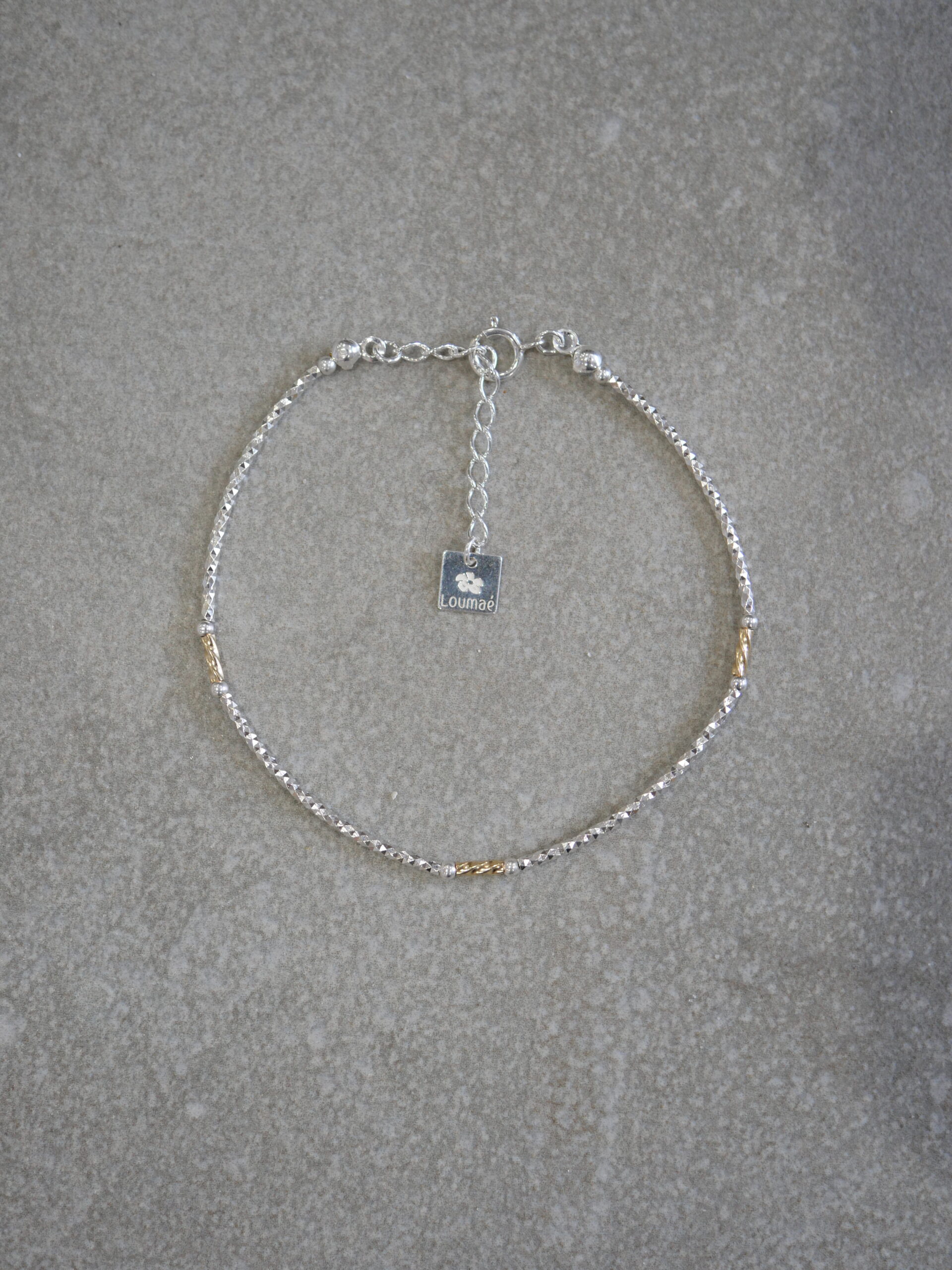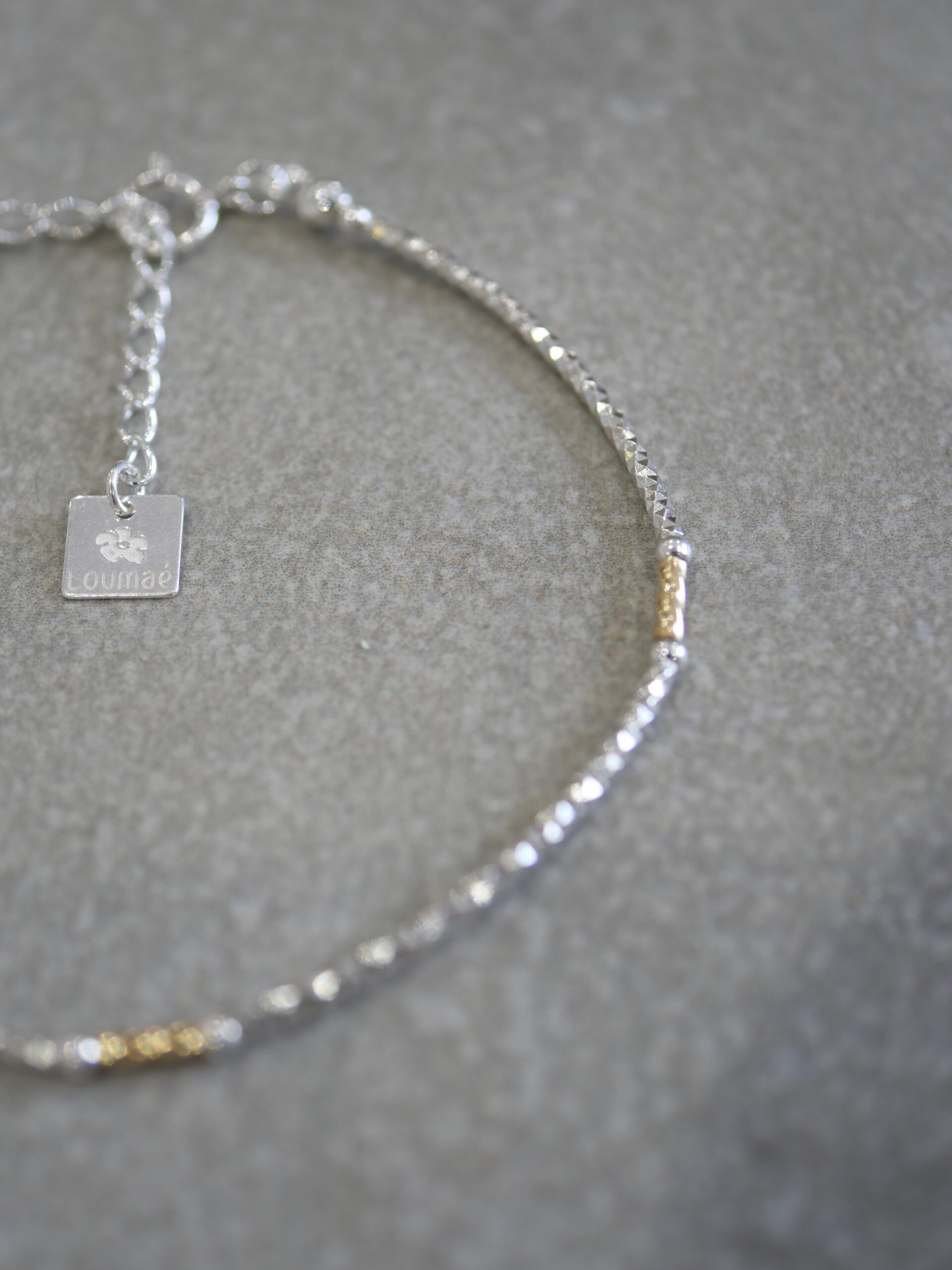 Le bracelet Anouck en or laminé et argent 925, est composé de tubes fins et délicatement texturés, ponctués de détails pour un contraste subtil et lumineux. Un bijou fin et contemporain qui habille le poignet avec élégance et naturel.