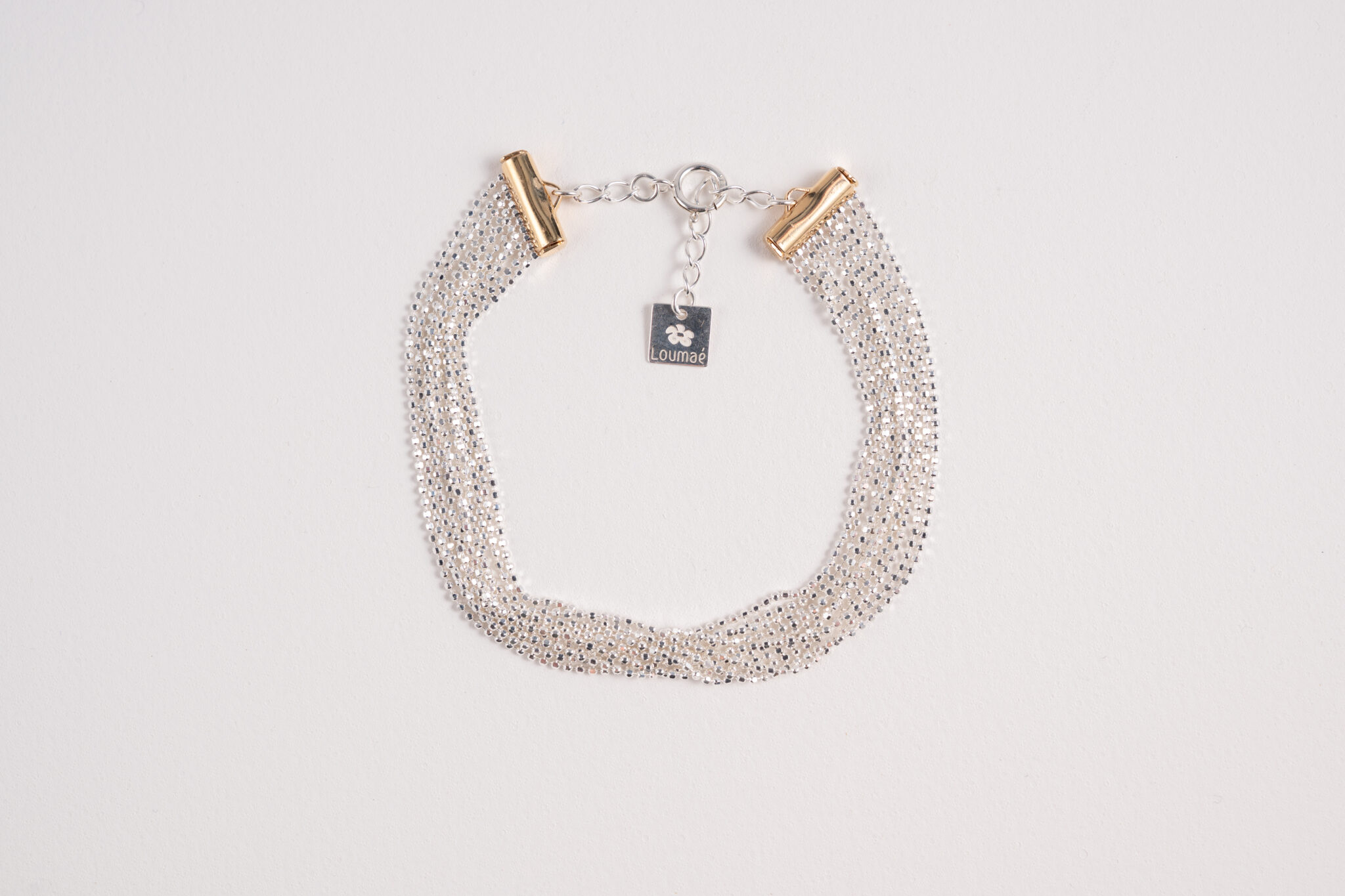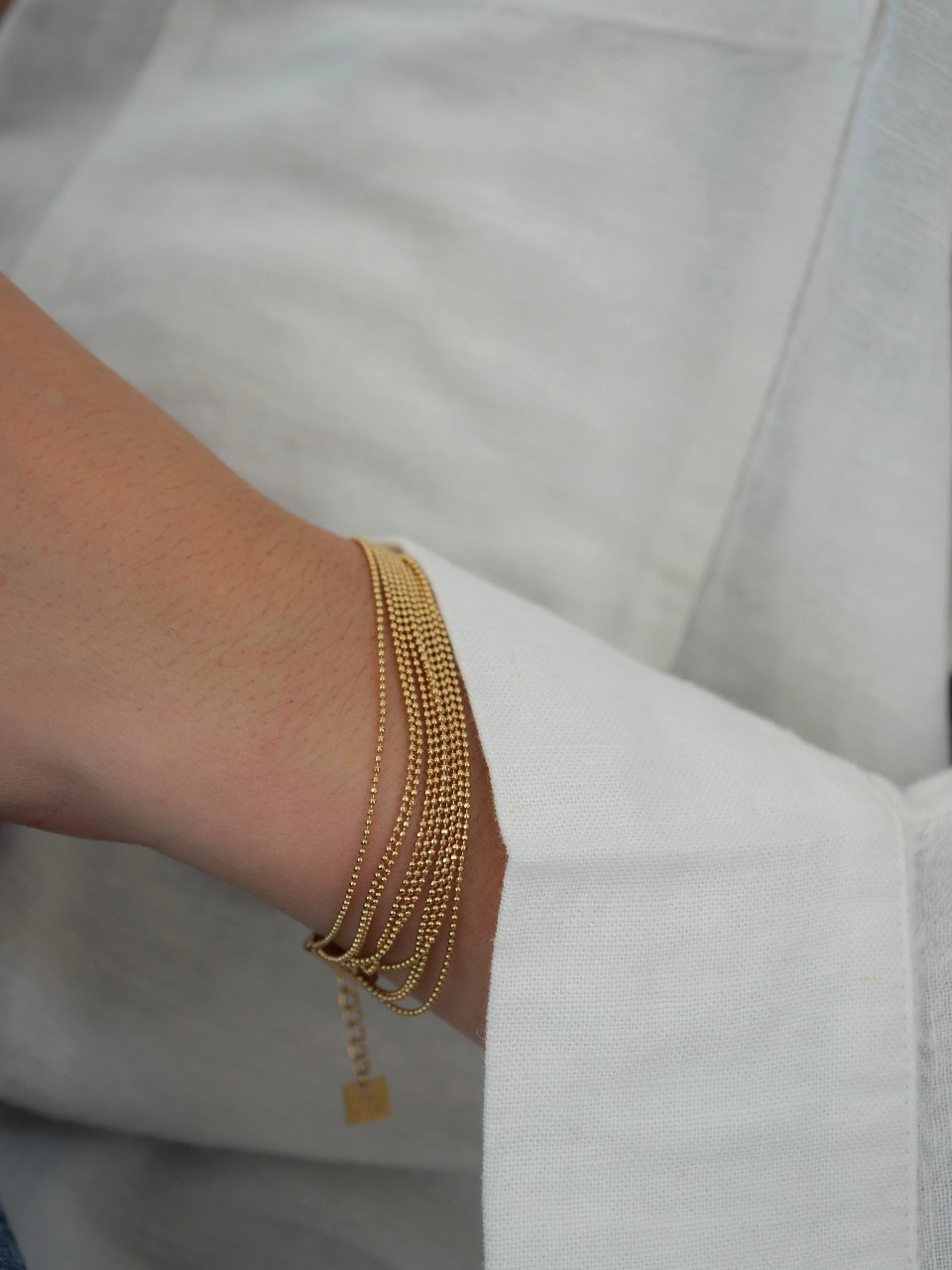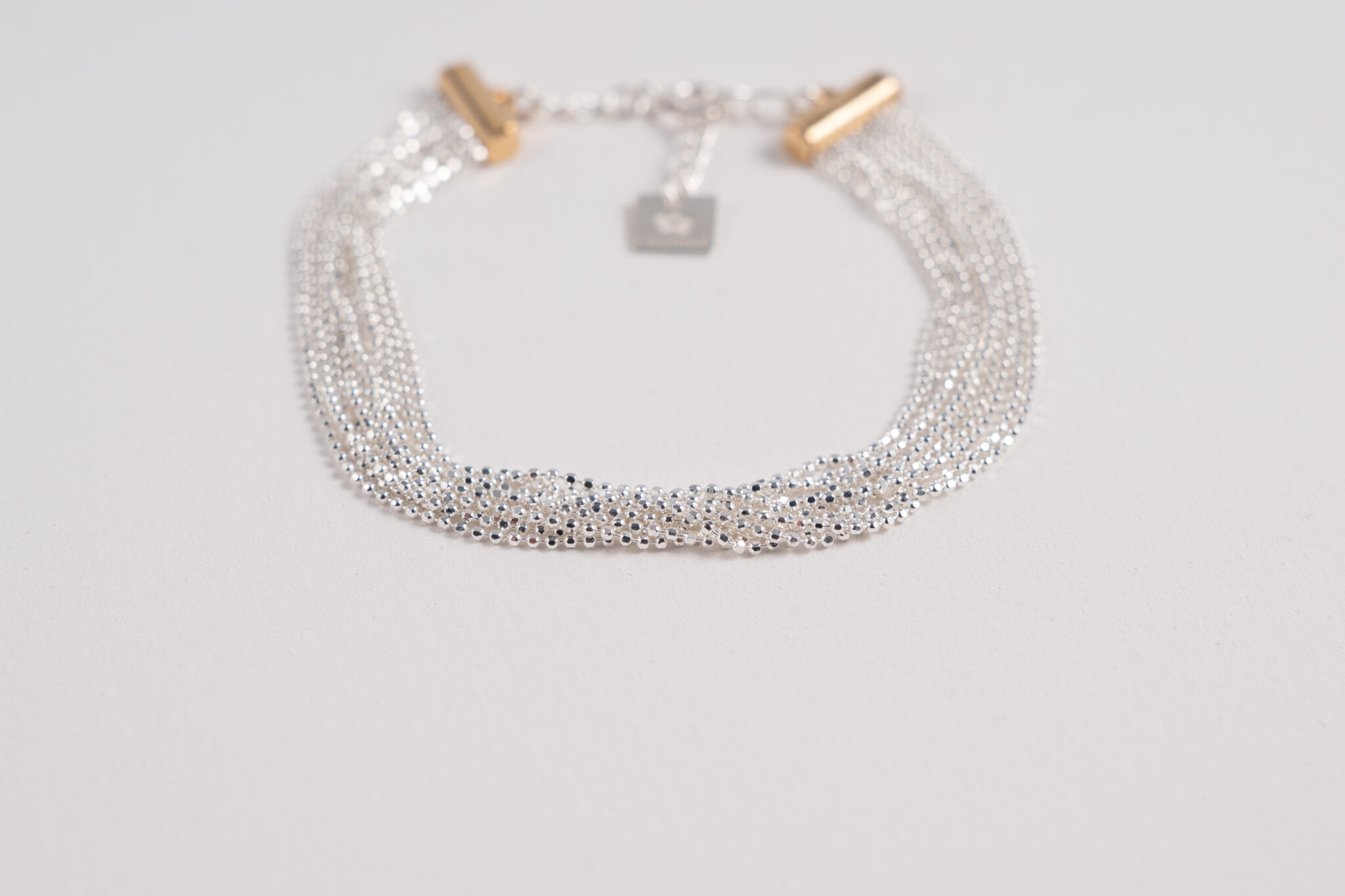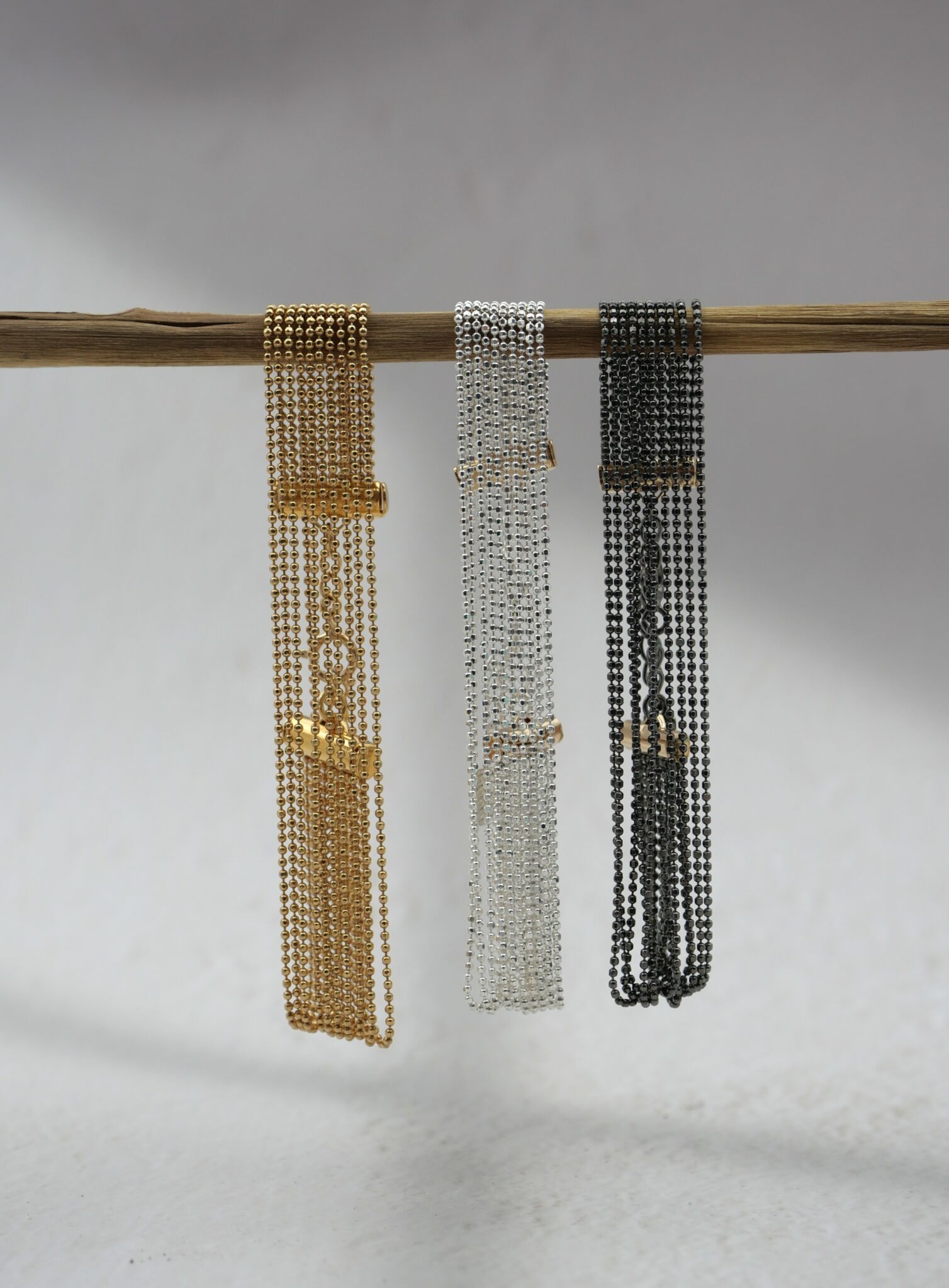 Ce bracelet manchette est composé de 10 chaînes fines qui viennent épouser le poignet avec une souplesse naturelle. Chaque mouvement lui donne vie : il capte la lumière, vibre, danse… et attire le regard sans jamais en faire trop.
