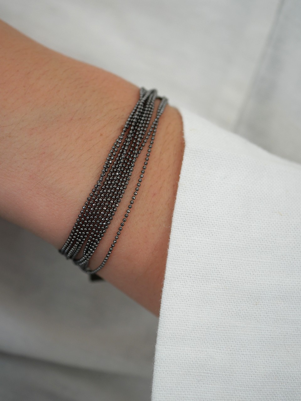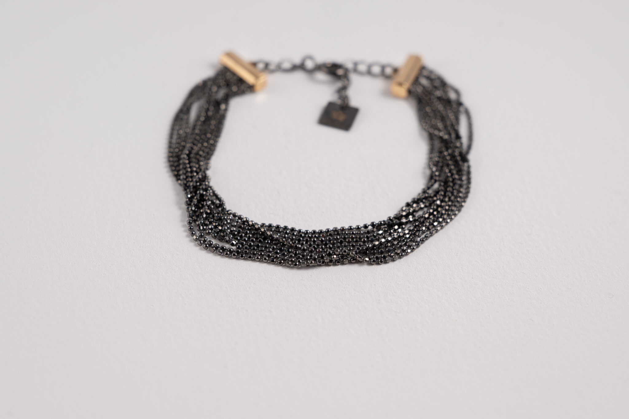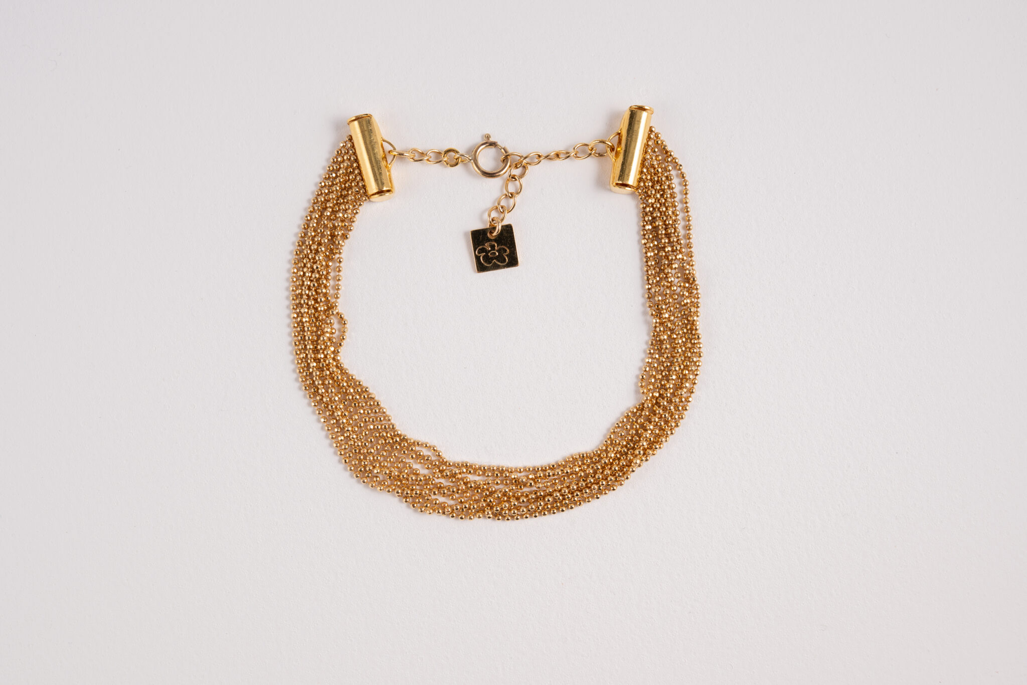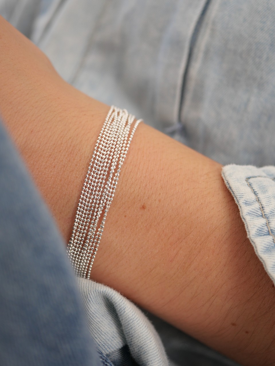 Ce bracelet manchette est composé de 10 chaînes fines qui viennent épouser le poignet avec une souplesse naturelle. Chaque mouvement lui donne vie : il capte la lumière, vibre, danse… et attire le regard sans jamais en faire trop.