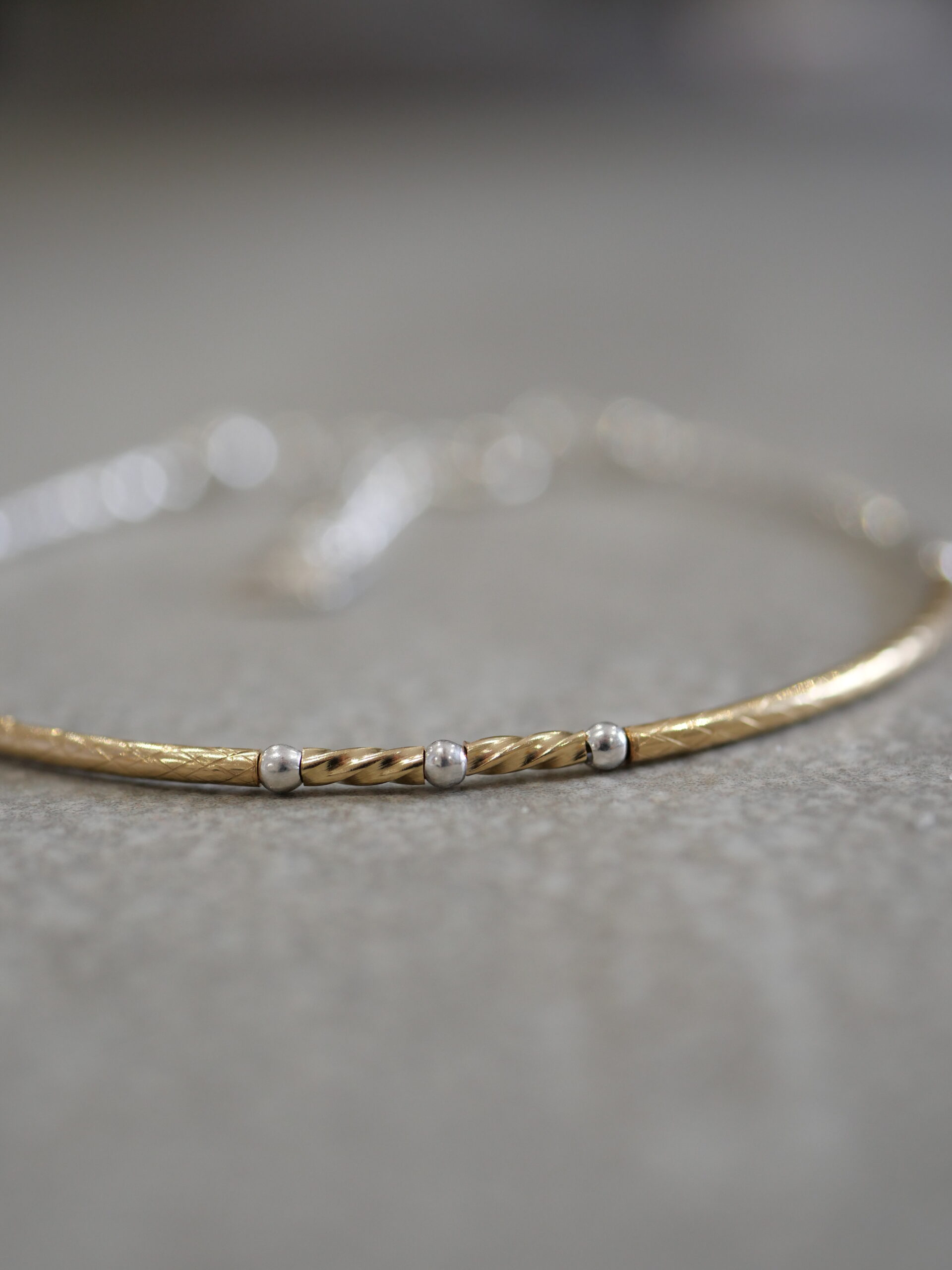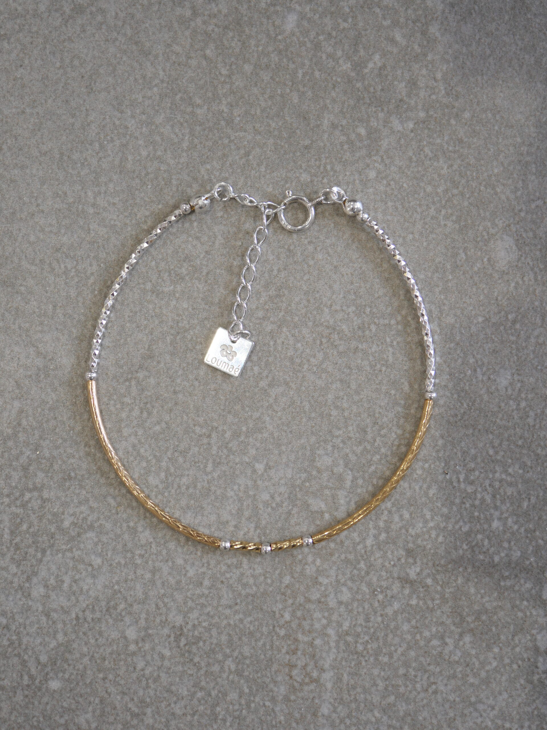 Le bracelet Maureen en or laminé et argent 925, est composé de tubes fins et délicatement texturés, ponctués de détails pour un contraste subtil et lumineux. Un bijou fin et contemporain qui habille le poignet avec élégance et naturel.