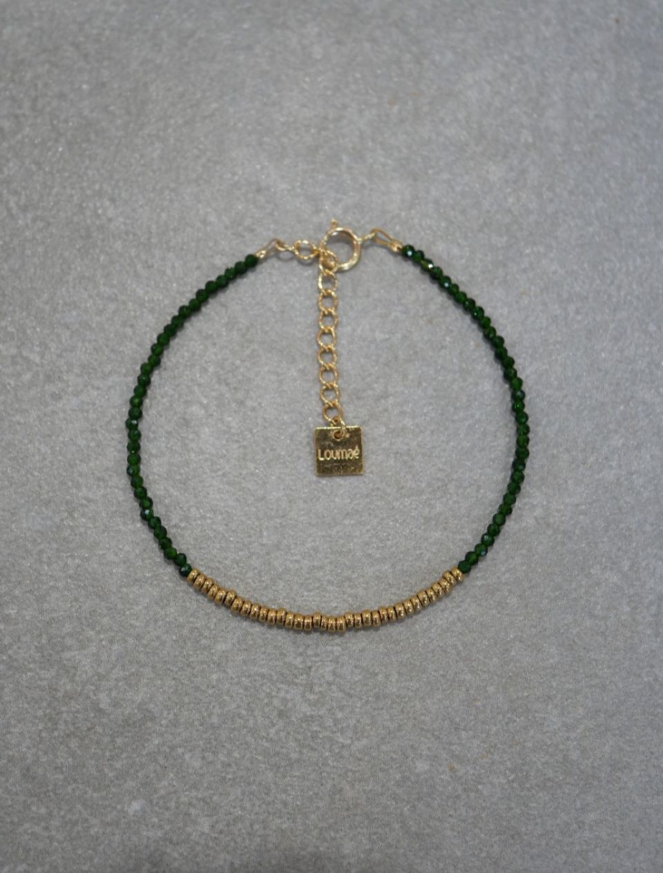 Enveloppant le poignet d’une pluie d’étoiles vertes, le bracelet Stella green mêle la profondeur mystérieuse de la pierre à l’éclat chaleureux de perles dorées.