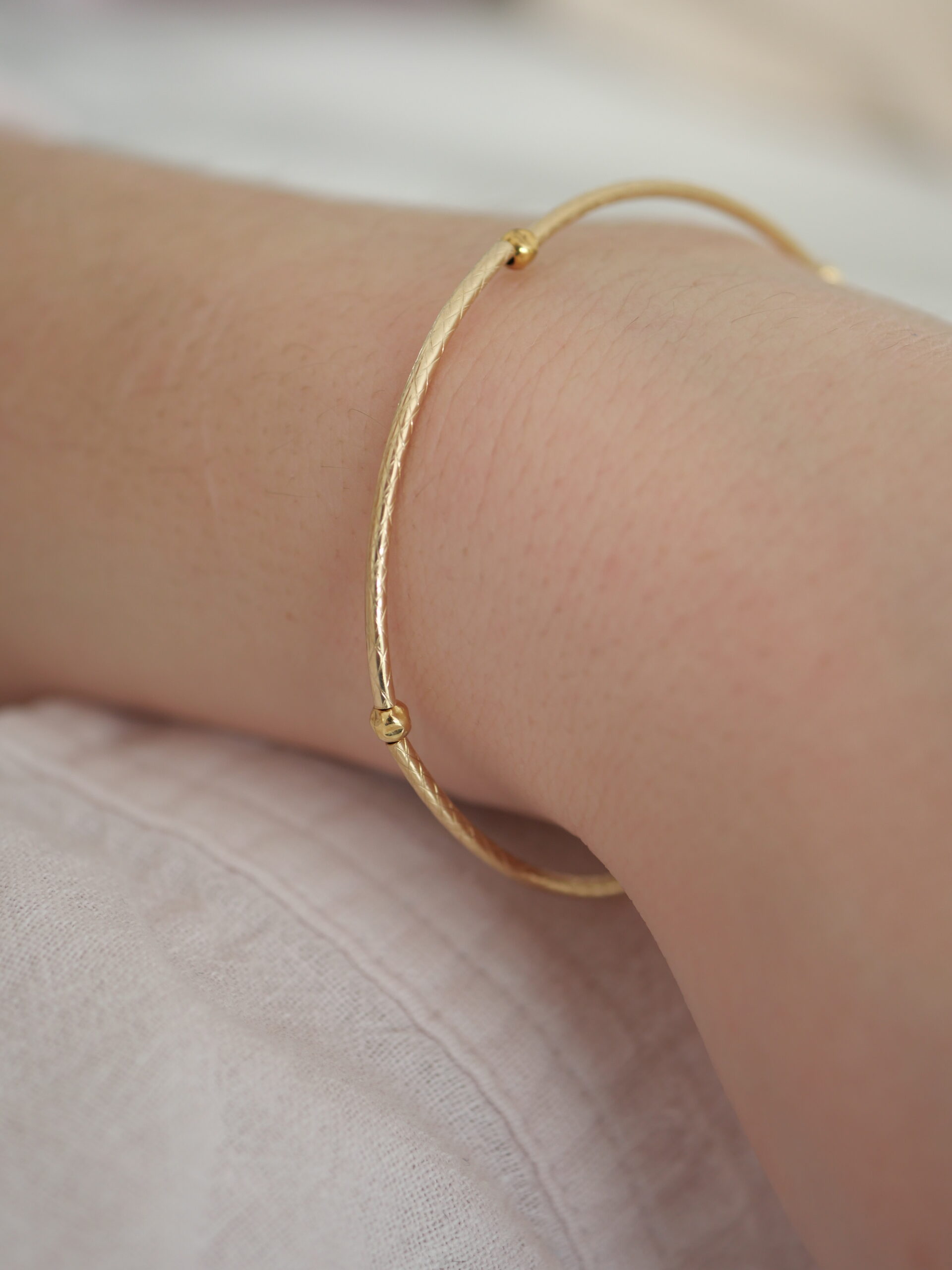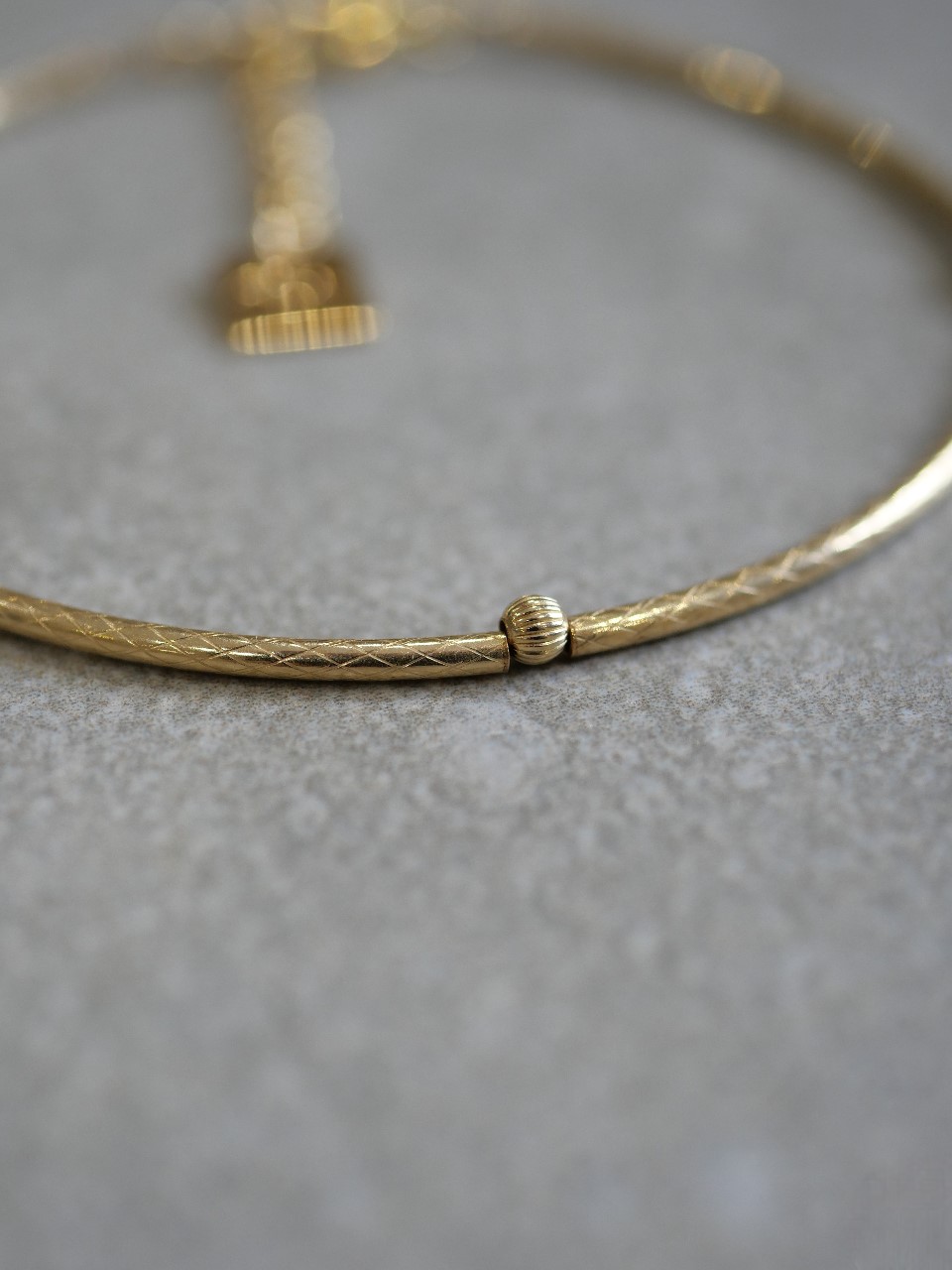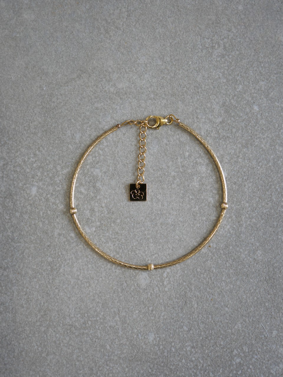 Découvrez la beauté des détails du bracelet Thais, fin, en tube texturé et perle en or laminé (gold filled). Chaque courbe et chaque texture créent un bijou unique et raffiné. Parfait pour ajouter une touche d’originalité et de féminité à votre poignet.