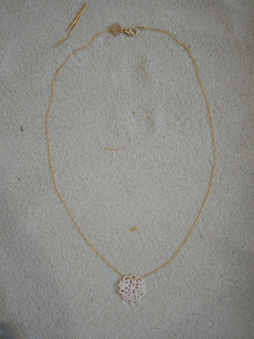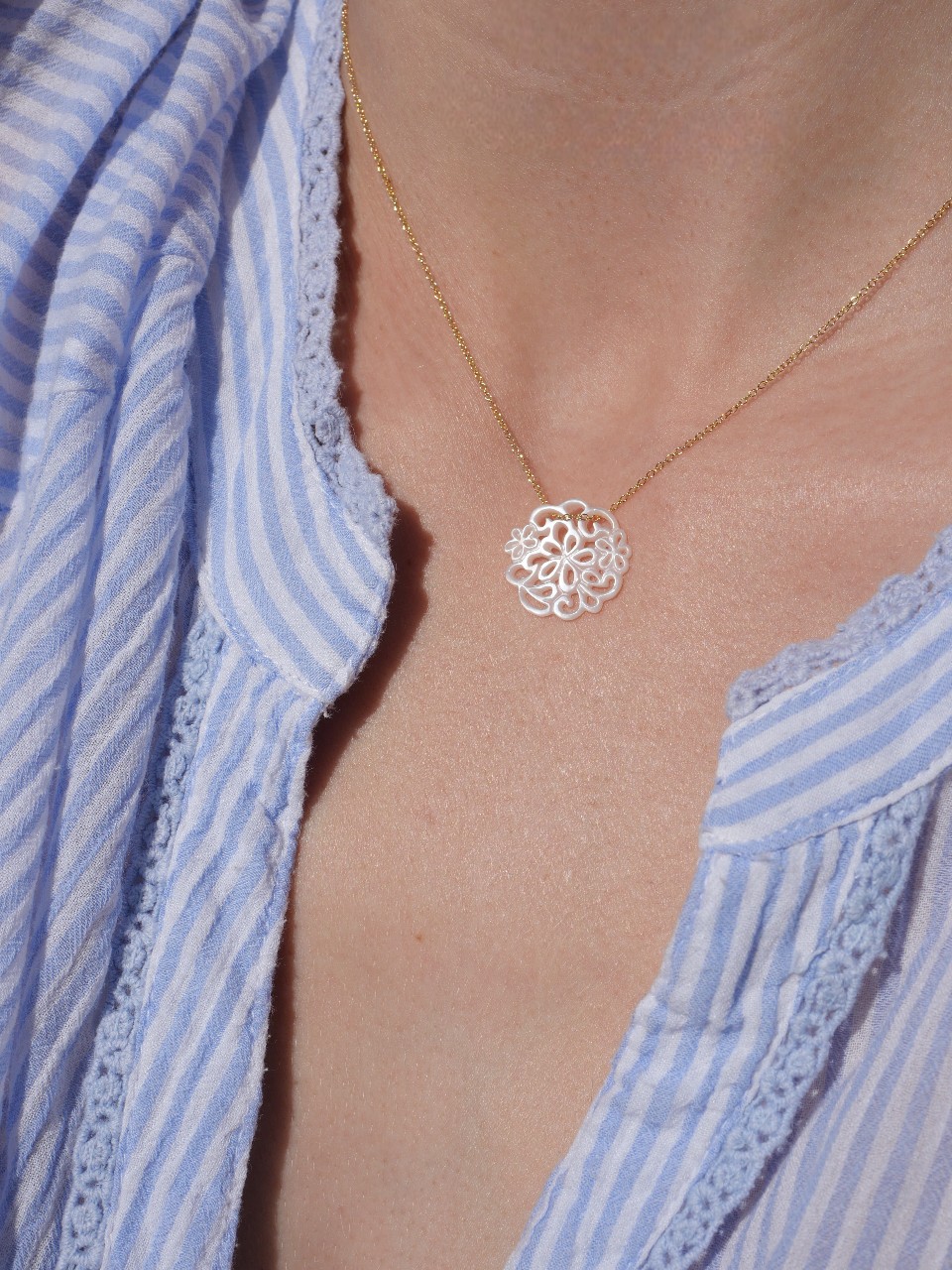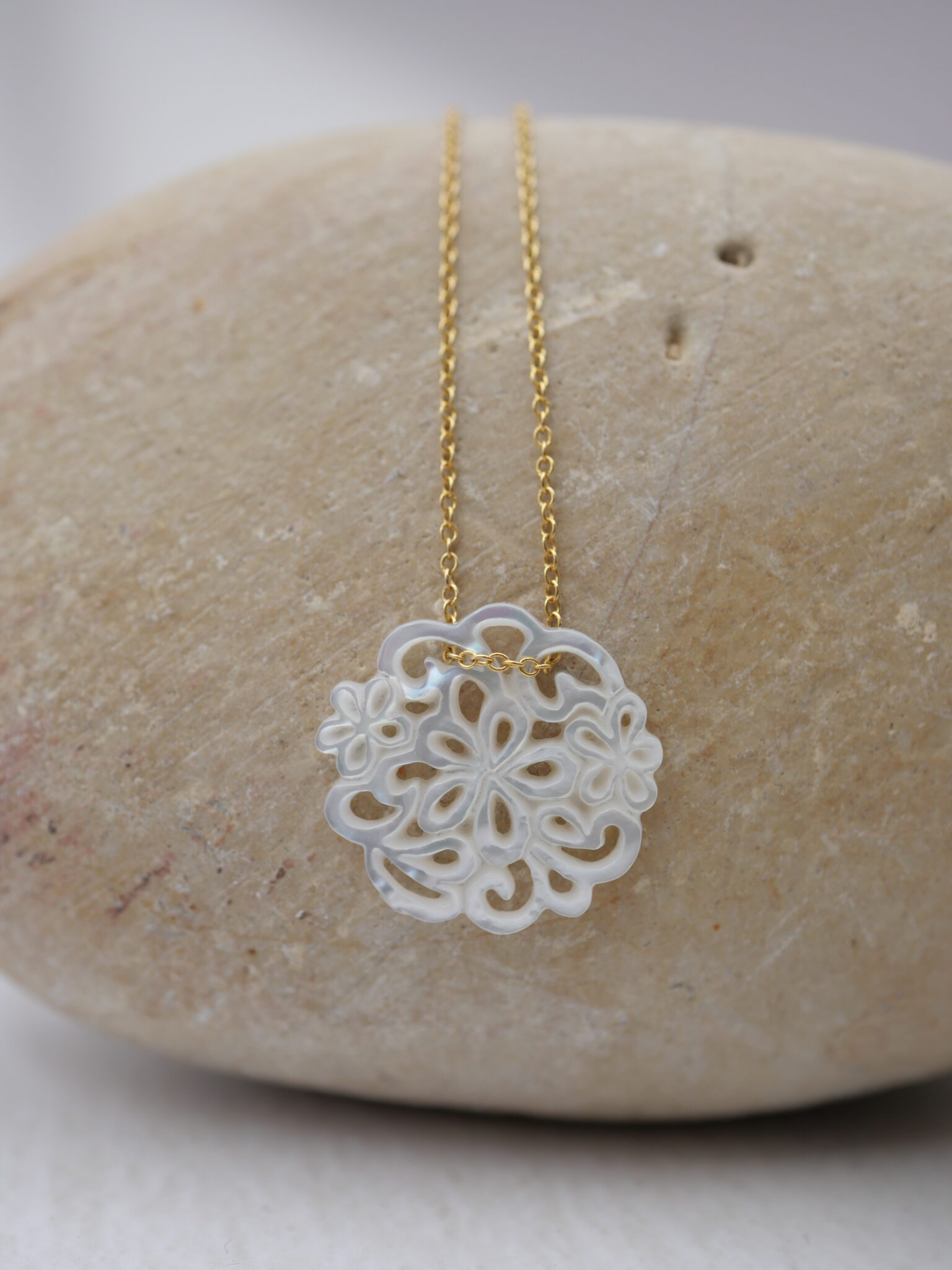 Découvrez la beauté intemporelle du collier Malou nacre blanche. Sa chaîne fine en gold filled, résistante et hypoallergénique, épouse délicatement votre cou. Au centre, un pendentif en forme de rosace ajourée révèle toute la finesse de la nacre blanche. Chaque détail de ce bijou a été soigneusement travaillé pour créer une pièce unique et raffinée. Parfait pour ajouter une touche d’élégance à toutes vos tenues.